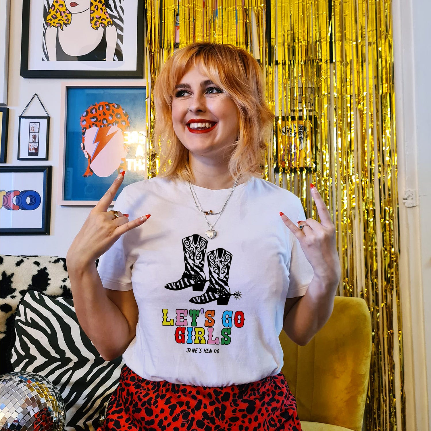 If you would like the any names or the date / details of your wedding day or hen party printed onto the tee, please add this in at the notes section at the checkout.